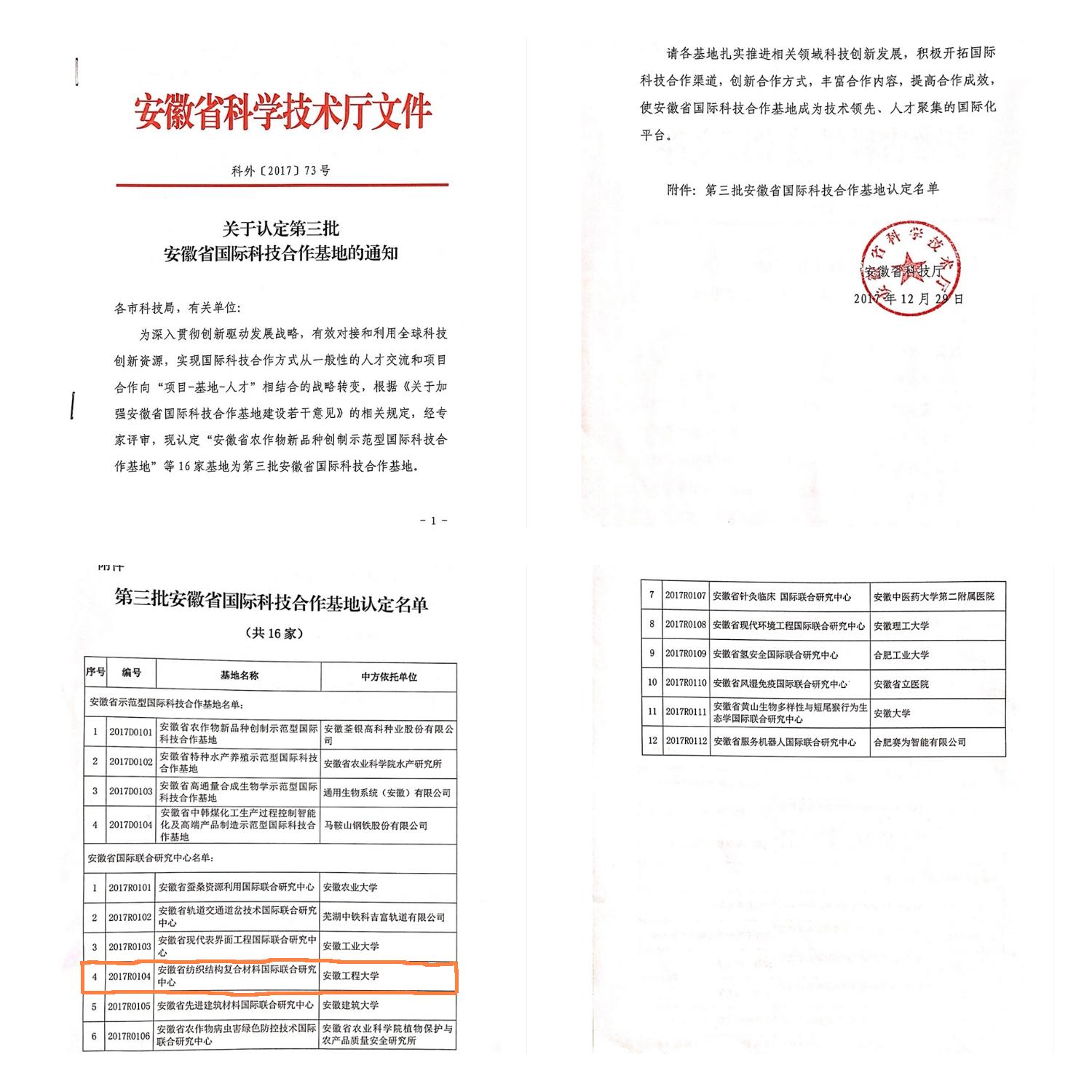 近日,安徽省科技厅下达了《关于认定第三批安徽省国际科技合作基地的通知》科外[2017]73号文件,认定全省16家基地为第三批安徽省国际科技合作基地。我校纺织服装学院申报的“安徽省纺织结构复合材料国际合作研究中心”喜获立项,这也是我校获批的首个国际合作科研平台。