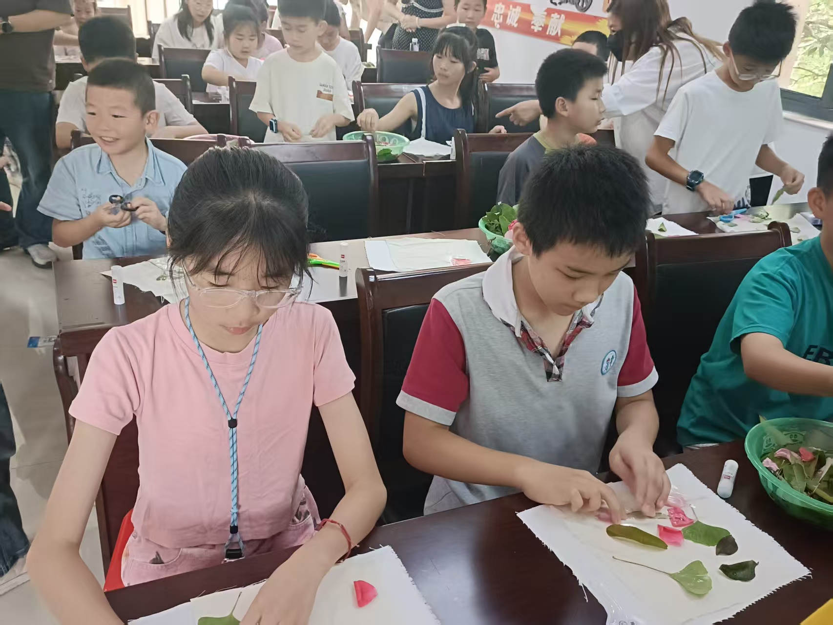 活动中,志愿者讲解植物染原理、流程及工具使用方法,随后分发布料、剪刀等材料并现场指导。青少年们巧布树叶,经敲打等工序,制作出独具创意的植物染作品。成品展示时,各小组分享灵感与心得,现场气氛热烈。活动尾声,志愿者点评鼓励并合影留念。