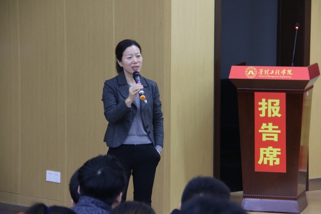 来自海螺集团的张晓东将海螺集团的管理情景搬上了课堂,结合海螺集团的实际经营管理状况对大学生提出了新的要求,她生动的分析当代90后大学生的现状,提出初入职场的毕业生既要遵守制度又要追求创新与突破,除了要掌握必备的办公技能,还要对自己的职业生涯做合理规划。