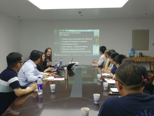 Juho Hamari首先介绍了他的研究团队在游戏化研究领域所取得的进展,并结合信息系统科学等领域研究前言的梳理,与参会师生分享了国际期刊学术论文撰写的要点、个人经验和投稿过程;接着,Juho Hamari结合丁一、曹雅琴和李小东三位博士的工作论文展开讨论、提出建设性的修改建议;最后,Juho Hamari与何朝林就未来进一步学术合作展开交流,并达成初步合作意向。