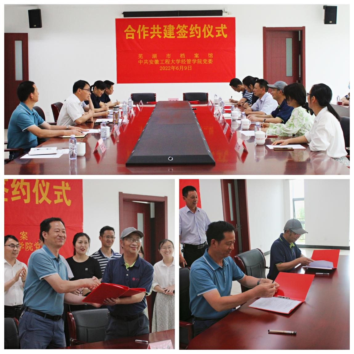何学军介绍了芜湖市档案馆的发展情况,包括档案馆的基础设施、人员配置、编研服务、特色展览等几个方面,阐述了档案在红色教育中的独特作用,以及在促进大学生了解芜湖,推进芜湖紫云英计划中所发挥的独特作用。市档案馆认真贯彻习近平总书记对档案工作的重要批示,传承红色基因,用心用力服务党史学习教育,通过馆内资料展现芜湖历史印记与腾飞发展,激励00后大学毕业生扎根芜湖的意愿,为芜湖发展创造优异成绩,这与学院立德树人、教书育人的理念相得益彰,希望未来双方能进一步加强交流与合作。章兵就学院的基本情况及发展建设,党建、团建工作做了介绍与发言,希望共建双方通过“共学总书记讲话精神、共过组织生活、共强队伍建设、共享党建资源、共解群众急难、共推事业发展”等形式,推动基层党组织思想政治引领和理想信念教育能力进一步提升;通过开展校政产学研项目合作、课题研究,聚焦学科专业建设、教育教学工作、专业人才队伍培育引进,不断推动科学研究、产品开发、技术创新能力进一步提升;通过开展大学生就业创业、志愿服务项目合作,聚焦人才培养、毕业生就业、大学生实习实践和志愿服务活动,进一步提升人才培养质量、毕业生服务社会的能力,从而开启“共建互促、资源共享、优势互补、协调发展”的党建共建工作新局面。章兵对双方前期联合开展的“兰台印记”志愿服务活动、新生入学教育、党史学习教育等工作给予高度肯定,对市档案馆对学院的倾力支持表示感谢!在芜湖市档案馆的支持下,学院对青年大学生开展了芜湖市情教育和党史学习教育等主题活动,希望青年大学生通过芜湖档案馆的展览和资料了解芜湖,未来选择芜湖、留在芜湖、发展芜湖。双方表示将在党建学习交流、课题研究、社会实践、志愿服务等方面发挥双方资源优势,进一步扩大合作,党建、团建与地方发展深度融合,学校发展与芜湖市发展同频共振,创新开展党建、团建知识学习交流,深入学习党情党史,共同做好地方党建档案收集整理、开发和利用。促进双方党建团建与业务融合,创新开展主题党日、主题团日活动,助力红色档案搜集整理,开展形式多样的“党建+”、“团建+”学习交流研讨模式。