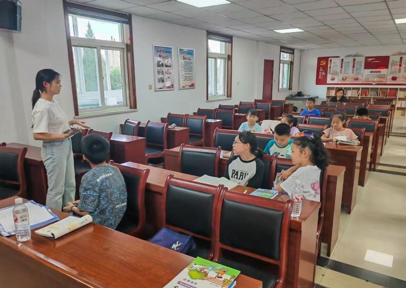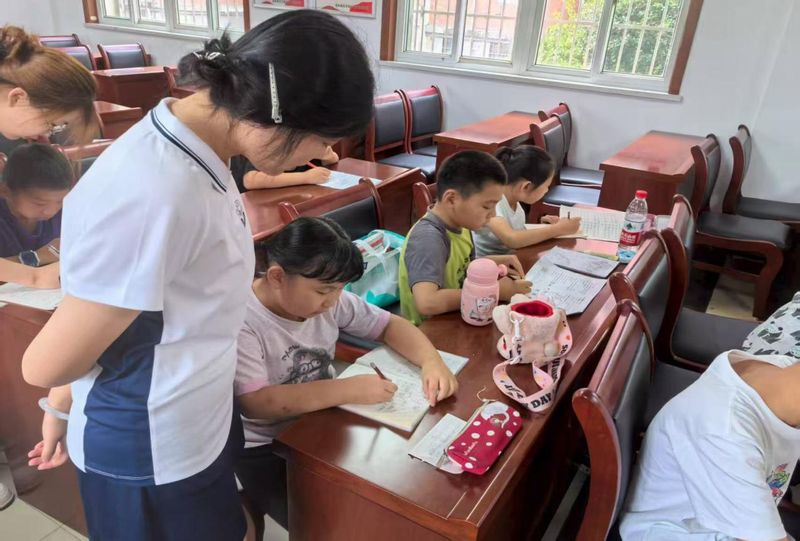 活动当天,在社区负责人的引导下,小学生们迅速在指定的学习区域安顿就位,现场井然有序。随后,团队成员认真细致地检查孩子们的暑假作业,针对语文阅读、数学难题、英语单词记忆等不同学科问题,进行一对一辅导与耐心讲解。除了基础的课业辅导,成员们还精心设计了心理素养提升和普通话推广的环节。7月22日下午通过游戏互动和交流分享,帮助小学生学习心理调节,培养良好的人际关系。同时,团队成员设计了趣味朗读等学习形式,有效纠正发音和规范用语,实现了知识辅导与素养提升的双重目标。