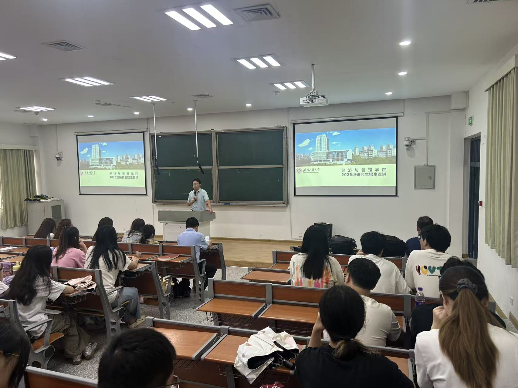 每到一处,宣讲活动前,组织现场学生共同观看我校精心制作的研究生招生宣传视频。视频以生动直观的方式,展现了学校的校园风貌、科研实力与学术氛围,迅速吸引了同学们的注意力,为后续的宣讲营造了良好氛围。