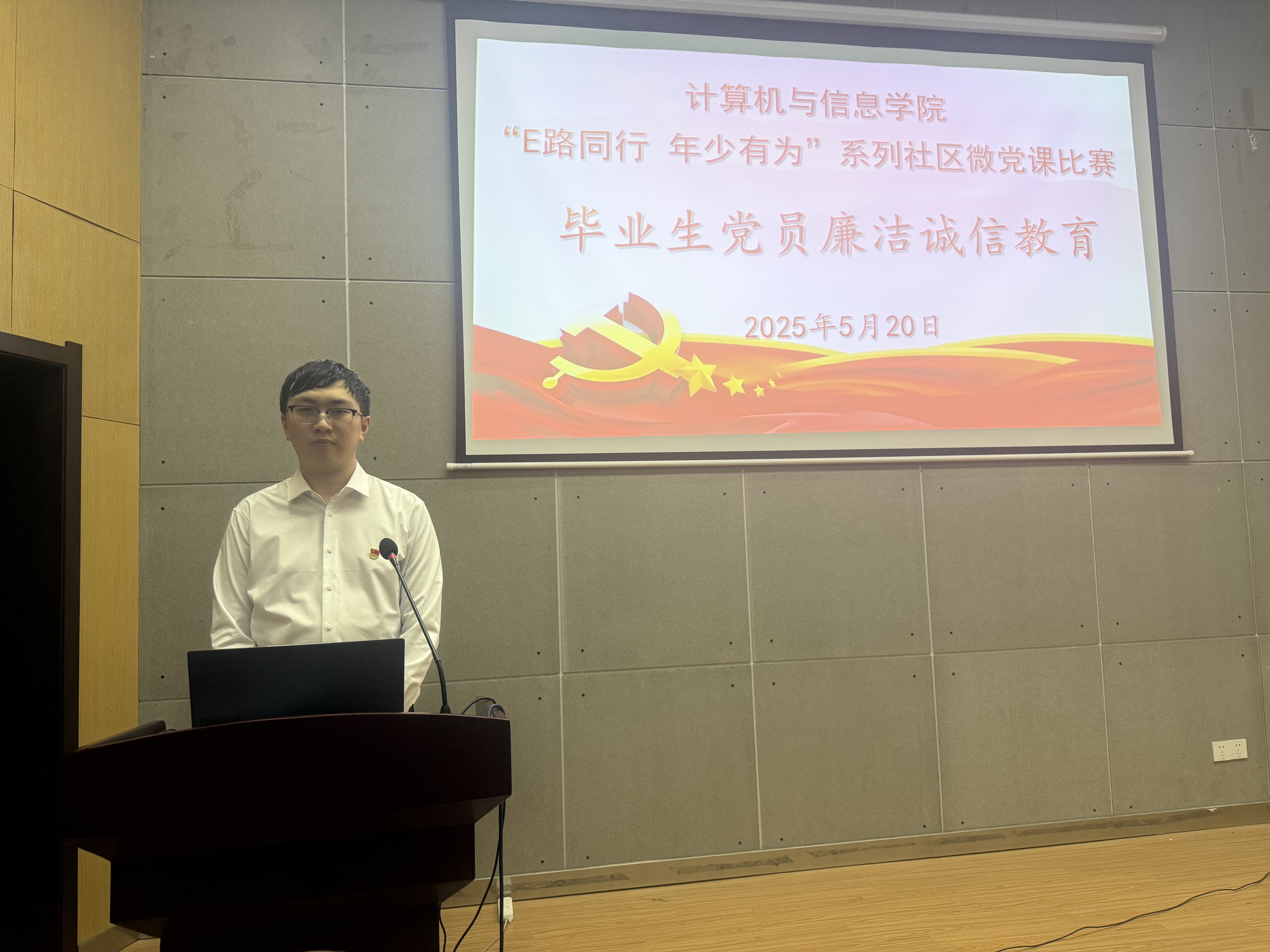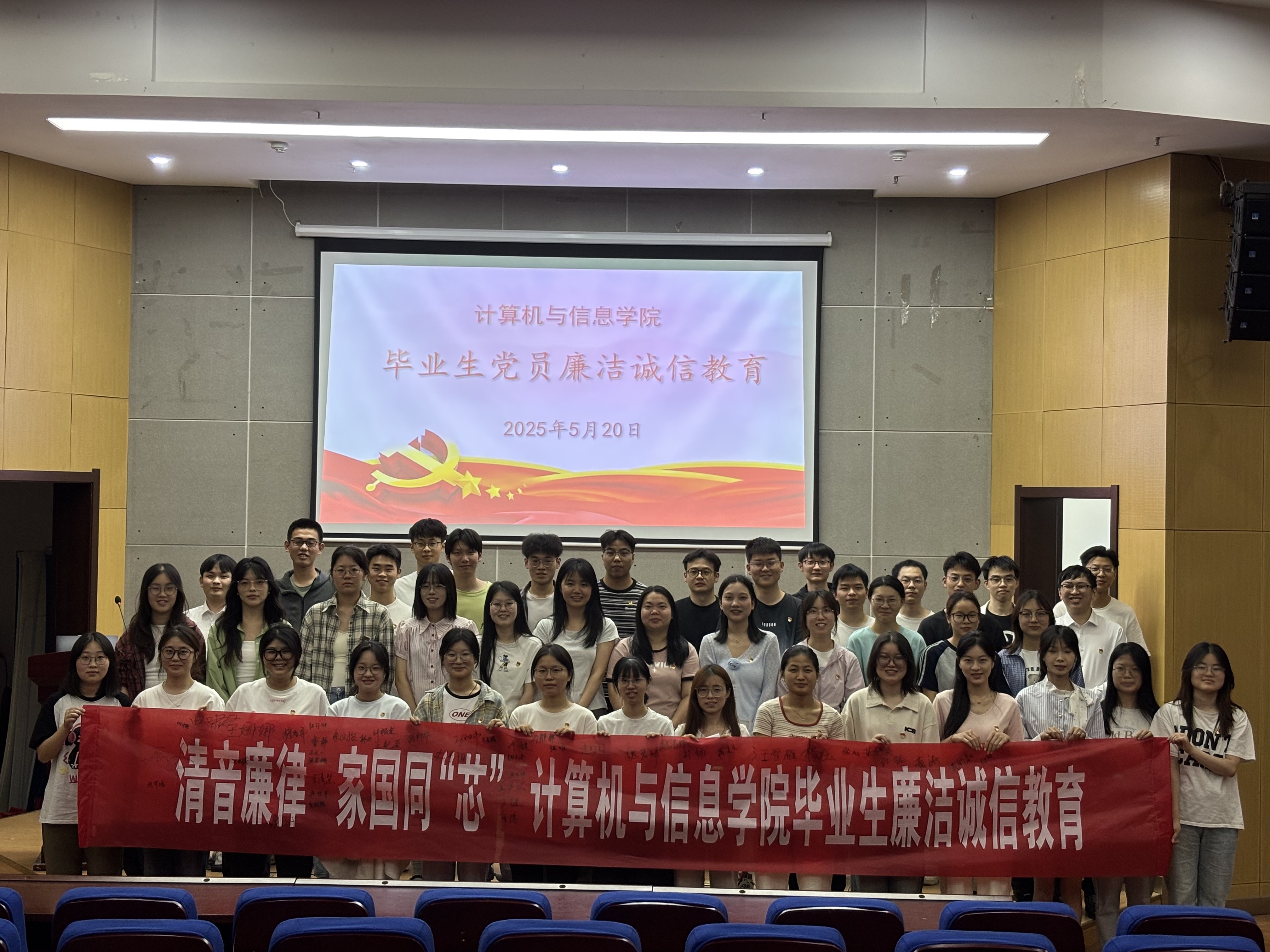 为强化毕业生党员的党性修养与廉洁自律意识,引导青年党员在步入社会之际筑牢思想防线、践行初心使命,5月20日,计算机与信息学院开展毕业生党员廉洁诚信教育活动。本次活动以“清音廉律·家国同‘芯’”为主题,通过微党课比赛、重温入党誓词、专题党课等形式,为毕业生党员上好廉洁诚信“最后一课”。学院党委副书记、纪委书记孙德茹、辅导员代表和毕业生党员参加活动。