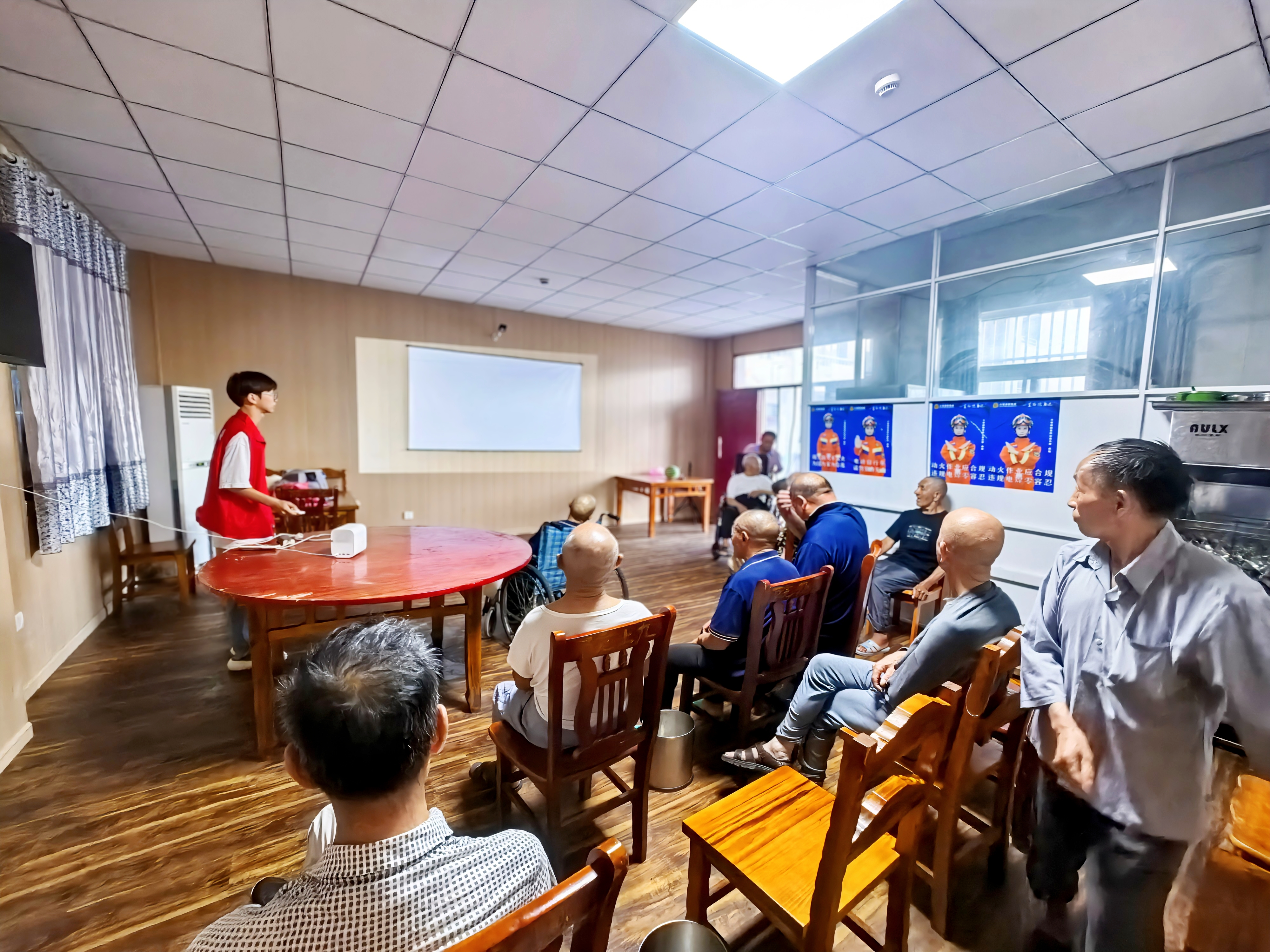 今年是纪念中国人民抗日战争暨世界反法西斯战争胜利80周年,团队成员连续三晚赴上土市镇兴林壹号养老院播放红色影片。队员们携带投影仪和幕布,早早地来到养老院布置场地。电影围绕抗战故事展开,当熟悉的旋律响起,经典的画面在幕布上跳动,老人们笑容满面。有的老人跟着剧情轻轻哼唱,有的则被逗得哈哈大笑,整个养老院都沉浸在欢乐祥和的氛围中。团队还特意为老人们准备了西瓜和生活用品,活动现场气氛热烈。