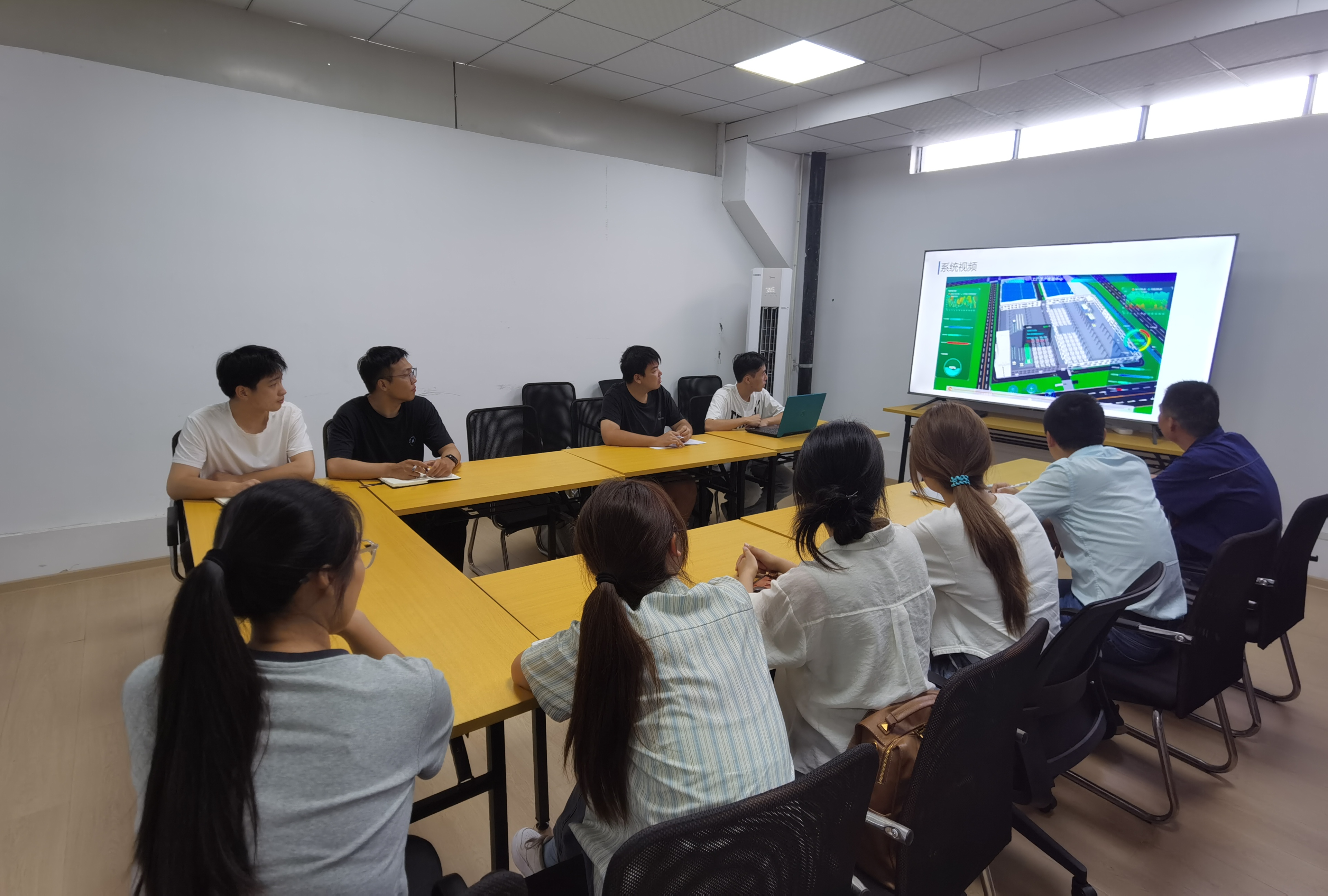 项目团队首先汇报了暑期在工厂数字孪生开发和车间综框车无人驾驶改造方面取得的成果。通过创建数字模型,结合工业现场数据,实现对物理实体的虚拟映射,为企业生产流程优化提供了数据支撑和仿真环境。综框车无人驾驶改造项目则致力于提升生产物流效率,通过自动驾驶技术实现跨车间物料高精度智能运送。刘文学对项目团队的工作成果给予了高度评价,表示相关研究成果对企业推进智能化改造具有实际应用价值。