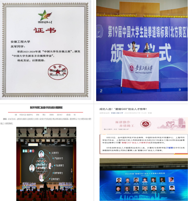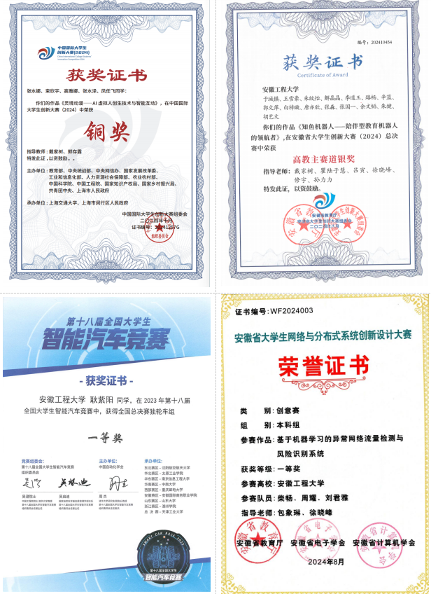 学院紧紧围绕立德树人根本任务,落实“以学生为中心”工作思想,扎实推进“三全六专”育人实践,依托双创中心功能型党支部和“一站式”学生社区功能型党支部,打造了“E”路同行之榜样有我、青春有我、倾听有我系列特色育人品牌,推动学生在学科竞赛、学业发展、身心健康、劳动实践等方面取得显著成效,育人品牌效应突出。近三年,学生在中国国际大学生创新大赛、全国大学生智能汽车竞赛等赛事中屡屡获奖,荣获全国大学生职业规划大赛国赛铜奖、亚洲“Z世代创变新势力”、“中国大学生自强之星”、中国大学生跆拳道锦标赛金牌、安徽省大学生武术比赛冠军等多项荣誉。此外,计算机协会荣登安徽省“活力社团”TOP100榜单,3个团支部获评校级“活力团支部”,4名学生获评校级“十佳大学生”。