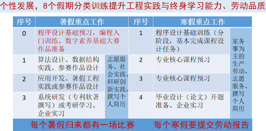 学院加强培养方案顶层设计,坚持五育并举,增加交叉选修课学分和专业培养方向,培养具有跨学科跨专业知识的人才。创新构建“8个学期+8个假期”的全过程育人体系。学期内,以五育并举为核心优化方案,通过增设交叉课程、设置专业方向及开放提前修读,系统强化学生知识与素养。假期中,则精准规划“4暑4寒”:暑假分层组织赛事、创新实践与考研辅导;寒假系统融入劳动教育、课程预习及项目实践,将假期全面转化为个性化能力拓展期,切实提升学生的创新与实践能力。