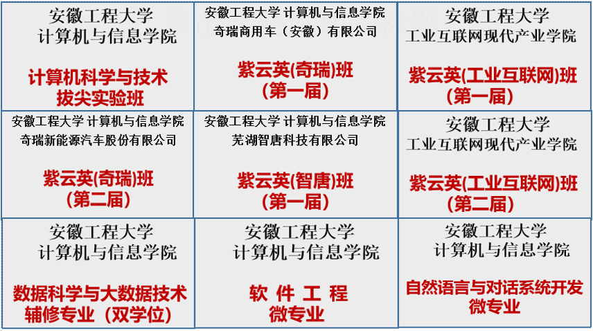 培养模式多样新颖。为推进个性化培养,结合国家、产业与企业需求,学院已开设4届计算机科学与技术拔尖实验班、5届企业定制班(紫云英班,已有4届获批芜湖市紫云英计划支持)、3届数据科学与大数据技术辅修专业,以及软件工程微专业、自然语言与对话系统开发微专业,着力推进交叉课程建设,在学校交叉平台开设交叉课程13门,育人成效显著。