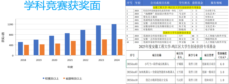 创新创业教育深化。学院致力于培养具有创新创业能力的复合型新工科人才,创新创业教育中心入选安徽省首批双创实践教学中心示范建设项目。该中心下设计算机、智能车、机器人、大数据与人工智能等9个创新开放活动室,有效孵化了一批高质量创新创业项目。近年来,学生在学科竞赛中年均获国家级、省级奖项500余项。