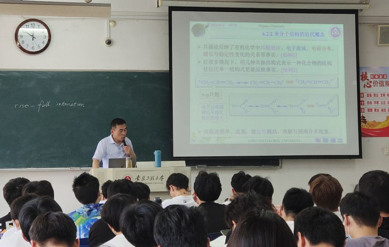 本次教学示范课由多次荣获校级教学骨干和管理骨干的学院资深教师宫建龙讲授,授课内容为《有机化学Ⅱ》第六章芳香烃;课程思路清晰、环节紧扣、由浅入深,重难点突出、设计合理,他结合多种教学手段,达到了很好的教学效果,使学生对知识的掌握更加深刻。他的授课情绪饱满、声音洪亮、肢体语言丰富,课堂上注重与学生之间的互动,适时提问引发学生思考,课堂代入感强。