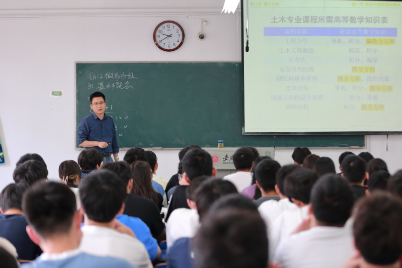 本次示范教学,梁勇讲授的内容是《高等数学(下)》第十二章微分方程。他从土木专业课程所需高等数学知识点展开,列举了微分方程在土木专业课中的应用,凸显了微分方程在专业后期学习的重要性。他通过“求曲线方程”和“火车刹车”问题两个引例,引入了微分方程,详细讲解了微分方程里的各种概念以及分类,利用两个例题使学生加深了对微分方程概念的理解。梁勇在教学过程中和学生充分互动、课程重难点突出、课堂讲授内容娴熟、语言表达清楚、理论结合实际,整节课学生精神饱满、认真听课,课堂纪律好,教学效果佳。