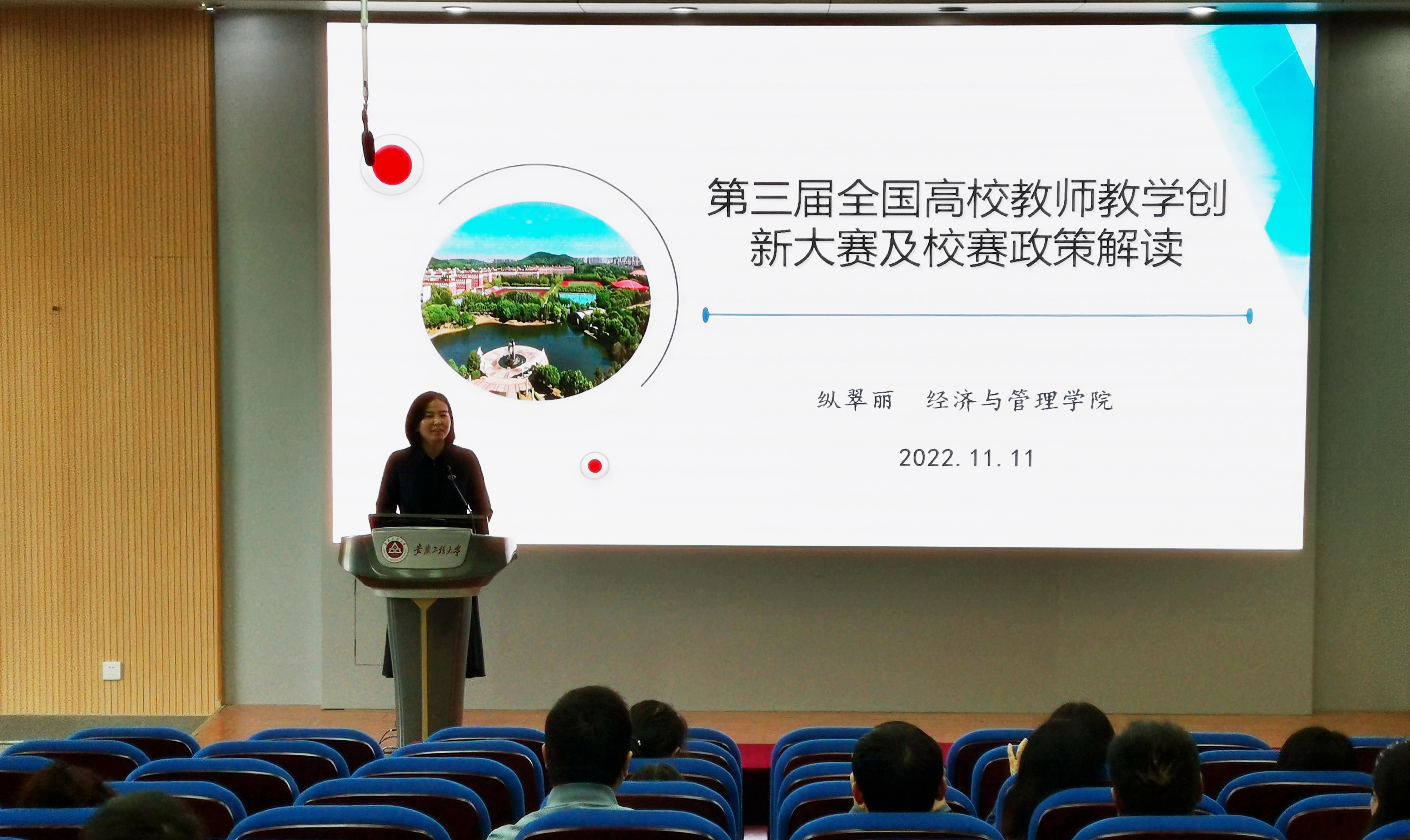 11月11日下午,教务处(教师能力发展中心)组织召开2022年教师教学创新大赛赛前培训会,邀请首届全国高校教师教学创新大赛全国三等奖、安徽省一等奖(副高组第1名)、经济与管理学院纵翠丽副教授做主题报告并与参训教师交流。计划参加本届教师教学创新大赛的教师及部分学院教学管理人员等共130余人参加本次培训会,培训会由教务处(教师能力发展中心)副处长(副主任)许钢主持。