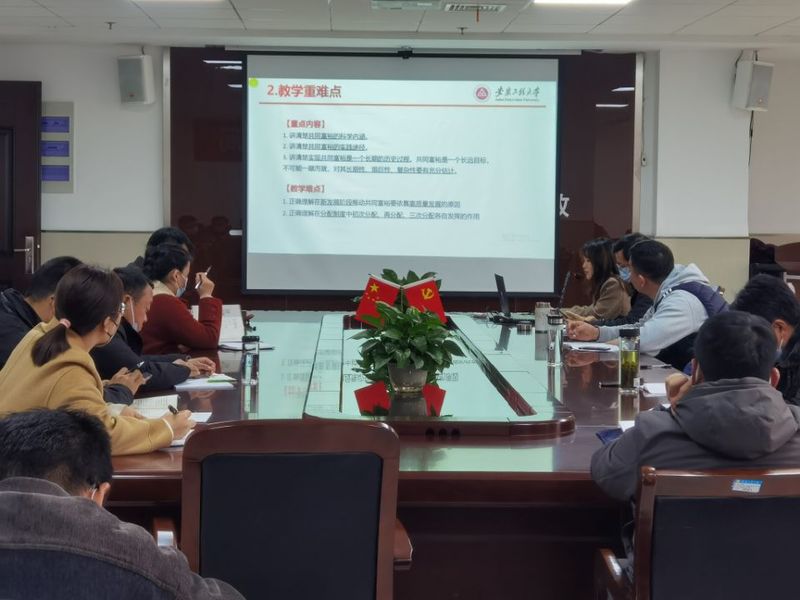 备课会上,杨孝旭老师对《不断推进全体人民共同富裕》教学专题进行了说课导学,她从教学目的、教学重难点、课程设计及教学反思等方面做了细致讲解。与会教师就教学设计相关内容进行了研讨和交流。