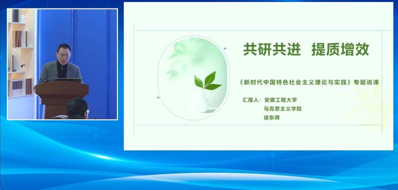 我校马克思主义学院副教授徐东辉和安徽师范大学马克思主义学院副教授张鑫围绕《新时代坚持和发展中国特色社会主义的重要保障》章节先后进行了教学展示。徐东辉从学科性质、教学目标、学情分析、教学重难点、教学方法和教学过程等六大方面进行了精彩的说课展示,展示过程逻辑严谨、语言精炼,理论剖析深刻,材料选用准确,结合现实分析透彻,PPT制作精美,展现了深厚的教学功底和独到的教学视角。
