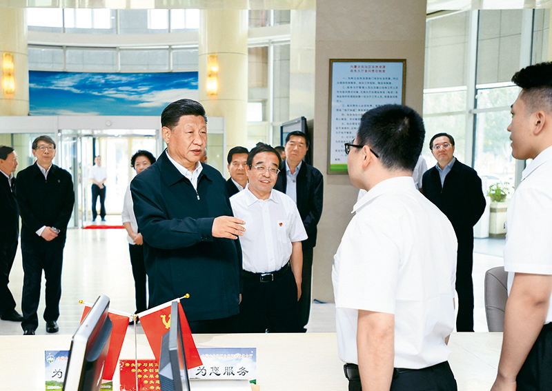 2019年7月15日至16日,中共中央总书记、国家主席、中央军委主席习近平在内蒙古考察并指导开展“不忘初心、牢记使命”主题教育。这是16日上午,习近平在内蒙古自治区自然资源厅自然资源政务大厅同工作人员交谈,了解开展主题教育和落实便捷高效政务服务等情况。 新华社记者 谢环驰/摄