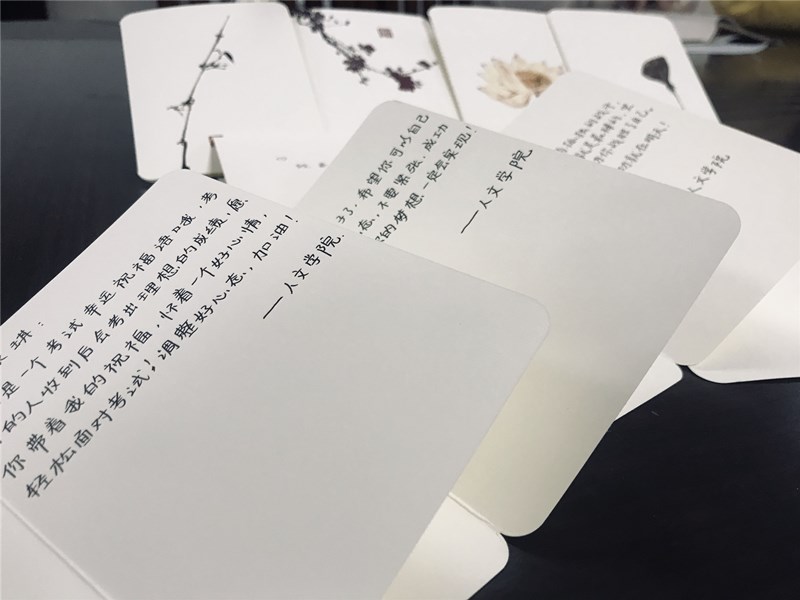 各位老师为考研学子送上精心挑选的备考文具与贺卡,满含期待地亲笔祝福。“路很苦,汗水是最美的书;坚持住,成功就在下一步;狂欢呼,相约巅峰唱赞歌”。“考研在即,希望我的问候,成为冬日里的一份暖阳。你在考场奋笔疾书,我在场外支持你,祝福你!考研加油!”文字虽短,却包含老师们浓浓的深情。同学们接到文具袋,爱不释手,读着祝福语,满怀感动。
