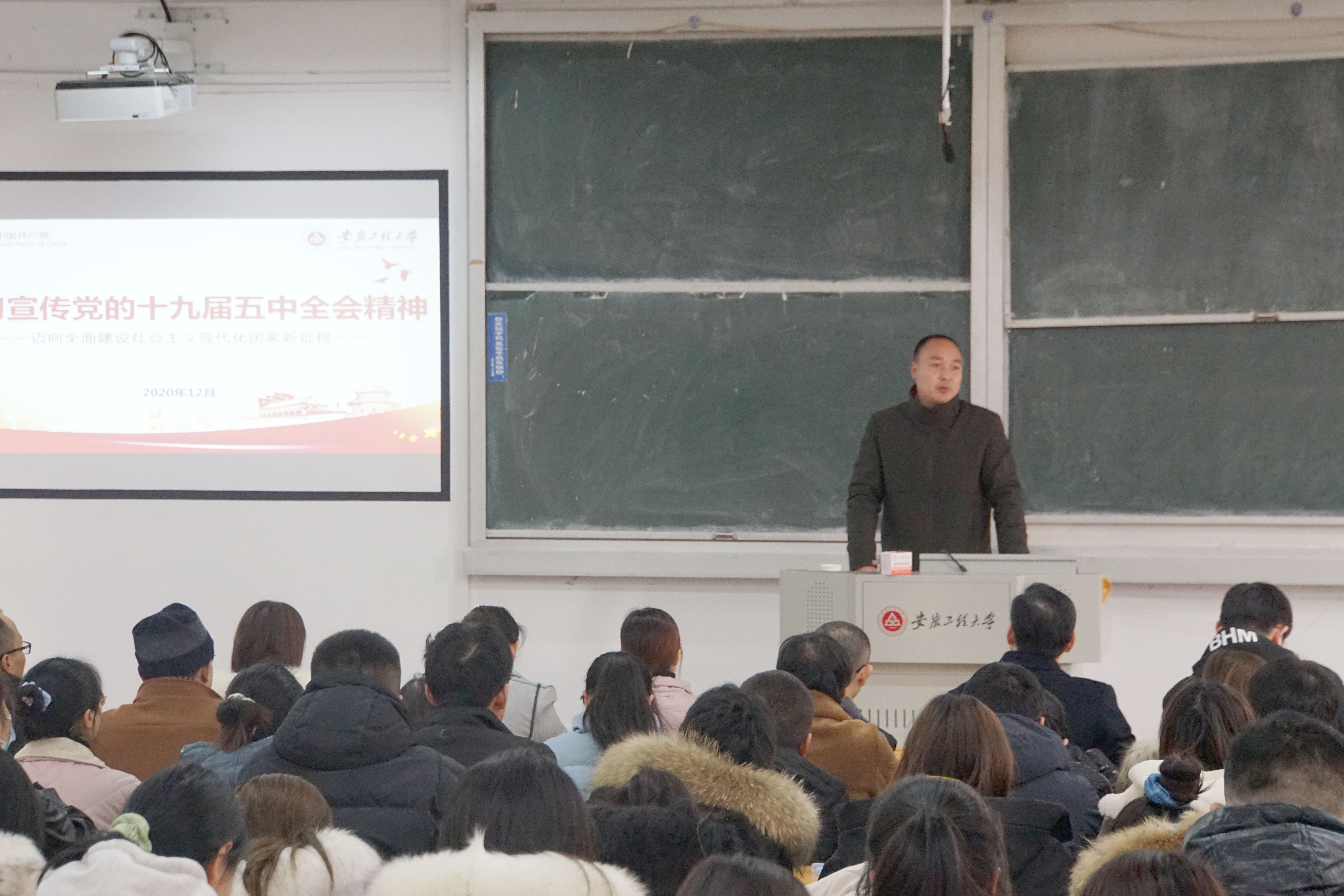 为深入学习贯彻党的十九届五中全会精神,1223日,人文学院在2J106举办了党的十九届五中全会精神专题学习宣讲会,校十九届五中全会精神宣讲团成员马克思主义学院副教授王效老师应邀作报告,学院全体教职工、学生党员和党校培训班学员参加,学院党委书记邓英扣主持会议。
