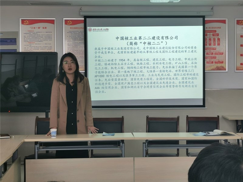 随后,中核二二华东区人力资源主管杨主任借助纪录片形式 ,就集团现状、聚焦领域、集团特色、工作宗旨和核心竞争力等方面对该集团做了简要介绍,以及针对本学院毕业生的专业情况介绍了对口岗位和平台发展情况。招聘会现场,杨主任还就工作地点、岗位标准和招聘要求等与同学们展开了愉快交流。