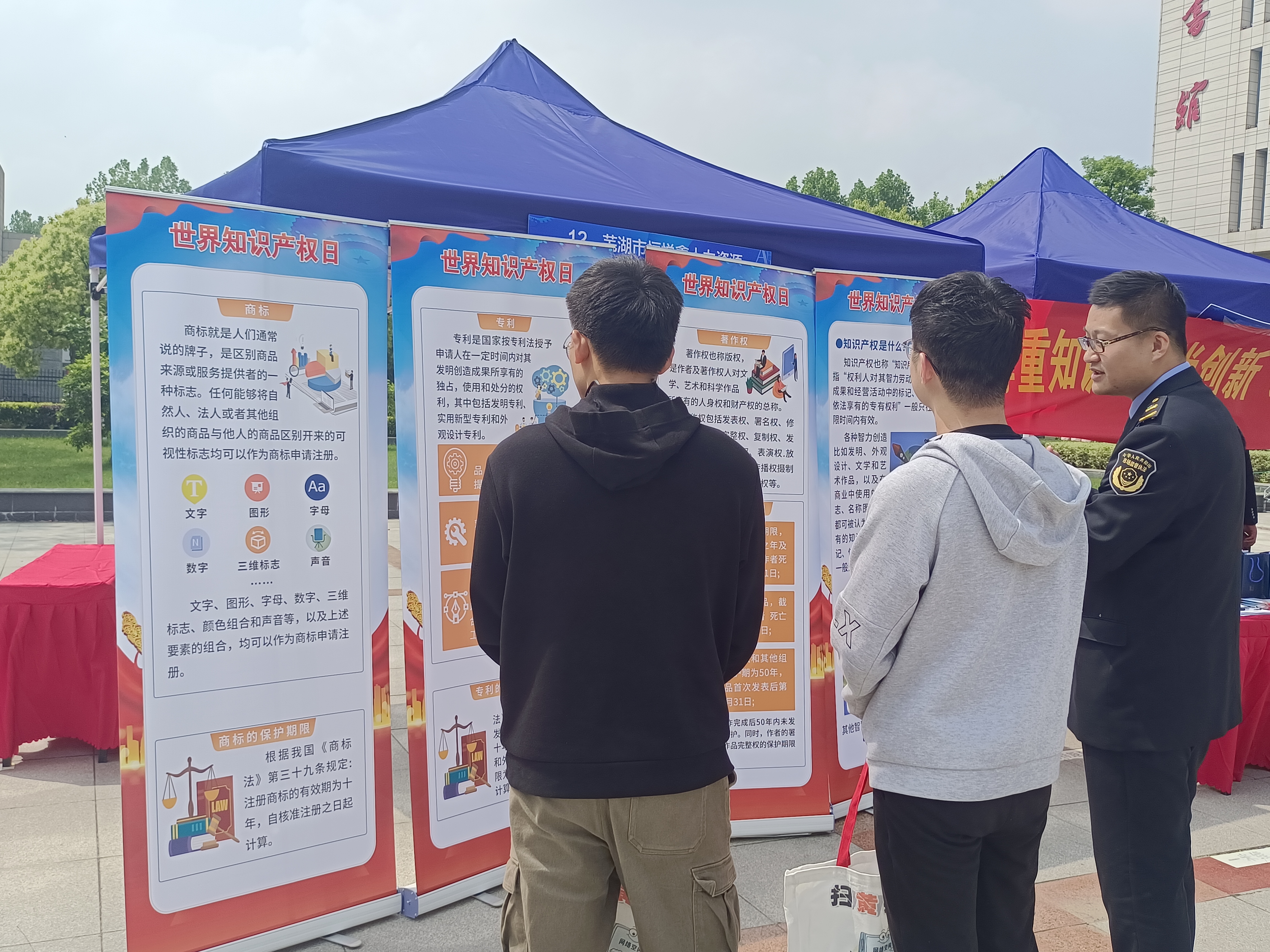 为深入贯彻党和国家关于知识产权工作的决策部署,进一步宣传知识产权保护政策及措施,进一步提升青年大学生的知识产权意识,2023年4月26日,在第二十三个世界知识产权日当天,人文学院邀请鸠江区委宣传部、鸠江区团委、鸠江区市场监督管理局、鸠江区文旅体局、鸠江区司法局、官陡街道办事处,在校本部图书馆东广场联合开展知识产权进校园宣传活动。