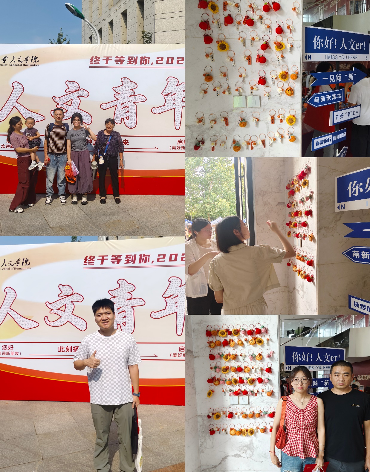 报到现场,一幅由全体新生姓名精心拼合而成的“人文青年”艺术字海报尤为引人注目。这封特殊的“介绍信”,不仅象征着每一位新生都是人文学院不可或缺的重要分子,更寓意着个体的独特性与集体的凝聚力在此刻紧密相连,共同铸就 “人文青年”的闪亮名片。新生们纷纷在此合影留念,记录下成为“人文青年”第一天的自豪与喜悦。迎新现场还融入了丰富的校园文化及学院特色,比如抽取学长学姐们的寄语,结果象征“传承”的“大一接力棒”;领取“人文学院”专属卡牌以及挂件,满怀热情迎接新生活,“前橙似锦”、“心想柿成”等美好寓意,满载学院对学子们深切的祝福与鼓励。