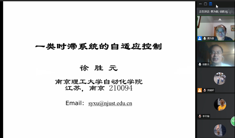 徐胜元教授做了题为《一类时滞系统的自适应控制》的学术报告,他首先对自适应控制概念、方法进行了介绍,然后针对一类不确定时滞系统,在参数上界未知的情形下,设计了自适应控制器,并从理论和数字机算例说明了方法的有效性。