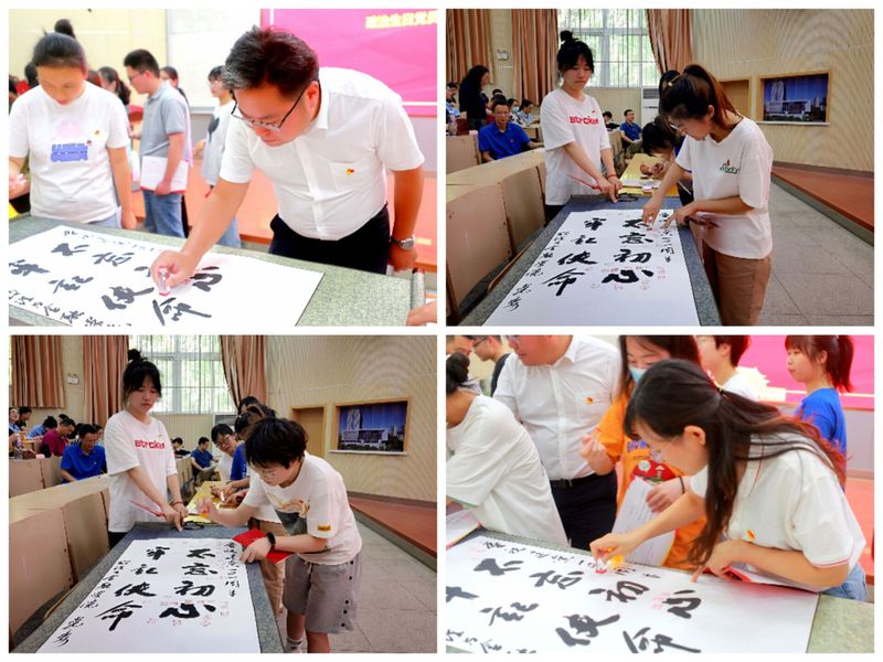 学院党委书记周毅仁为新党员发放《新党员入党通知书》、佩戴党员徽章;吴小太、何志恒为过政治生日的党员发放《政治生日卡》和生日礼物,过政治生日的党员在“不忘初心 牢记使命”的卷轴上郑重地印上殷红的印章,承诺新的百年“强国有我,请党放心”。在周毅仁的带领下,师生党员面向党旗、高举右拳,许下了“为共产主义事业奋斗终身”的铮铮誓言。