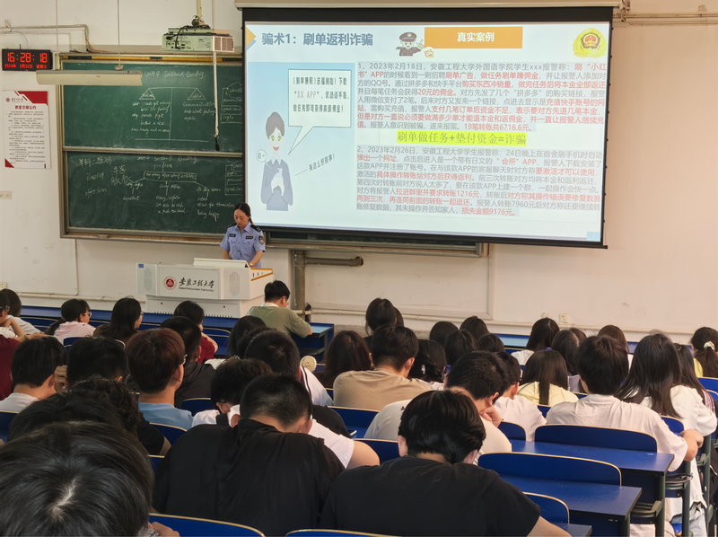 为筑牢校园“防诈骗,反诈骗”安全防线,进一步提高学生安全防范意识,为大学生“不信诈,不被骗”夯实坚实基础,5月22日,数理与金融学院开展防诈骗安全教育专题讲座。学院邀请城东新区派出所副所长李圣文、学校警务站高燕警官开展专题讲座,学院党委副书记何志恒、辅导员和2023级全体学生参加。