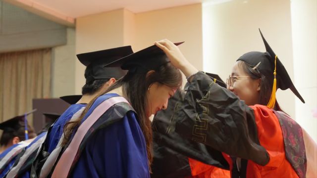 典礼现场,与会领导和教师代表为毕业生们逐一扶正流苏,象征着学业的圆满完成和新征程的开启,老师们与毕业生们握手、拥抱、合影留念,共同记录下了这一难忘的时刻。毕业班辅导员和教师代表共同合唱《再见》,悠扬的旋律中饱含对毕业生的不舍与祝福,将典礼氛围推向高潮。