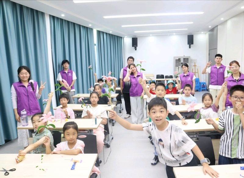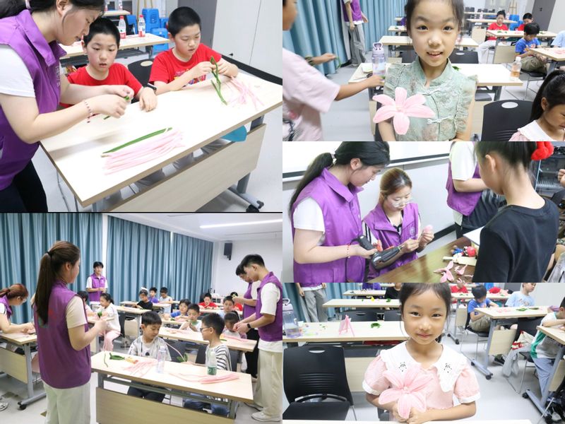 实践团组织了一场别开生面的扭扭棒手工课,教小朋友们制作“百合花”。在志愿者的耐心指导下,孩子们发挥想象力,互帮互助,一朵朵色彩缤纷的“百合花”在指尖绽放。统计241班的许贵琦同学分享道:“制作百合花就像解开生活的小谜题,每一次调整扭扭棒的弯折角度,都是在培养耐心与解决问题的能力。”活动不仅锻炼了孩子们的动手能力和空间思维,也增强了他们的团队协作意识。