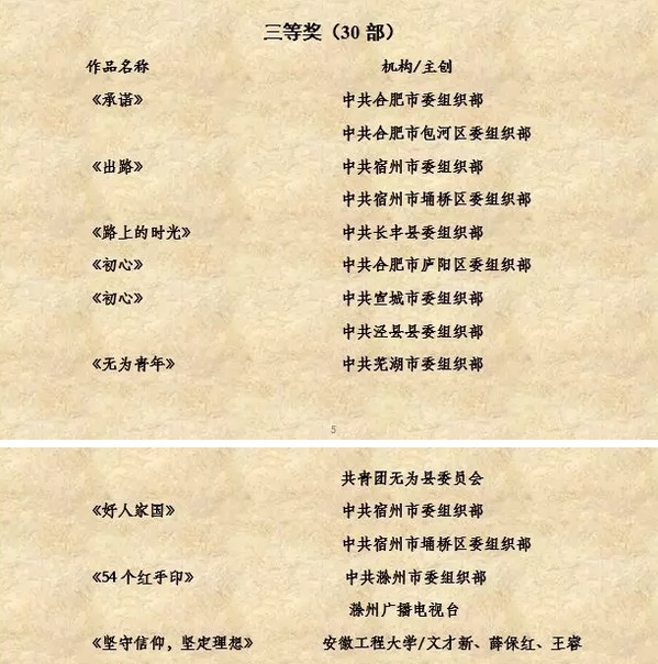 本次大赛由安徽省内各地、各单位精心组织,社会各界积极响应,踊跃参与,共有参赛作品454部。经形式审查、专家初评和网上展评等环节,共产生一等奖作品10部,二等奖作品20部,三等奖作品30部,优秀奖50部。其中全省高校中作为独创单位获得一二三等奖的仅有我校和安徽师范大学。