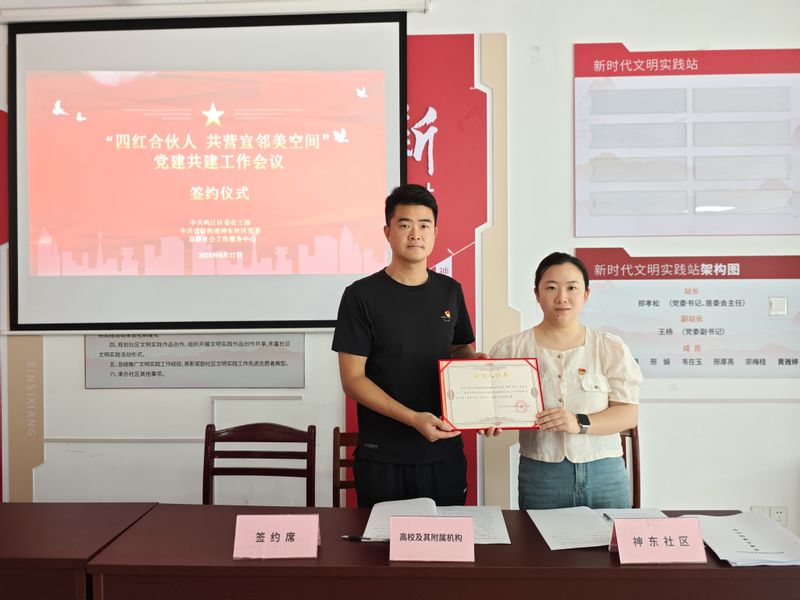 签约仪式上,范同军与神东社区党委书记共同签署了《“四红合伙人”党建共建协议书》。协议聚焦“组织共建、资源共享、活动共联、服务共促”核心目标,明确依托“红苗、红军、红商、红色堡垒”四维驱动模式,共同打造社区“宜邻美空间”,探索校地党组织优势互补、合作共赢的长效机制。社区党委书记对共建单位相关党组织的到来表示诚挚欢迎,并高度肯定本次共建对激发社区治理新动能的重要意义。她期望双方以共建协议为蓝图,将组织优势切实转化为服务效能,合力构筑美好家园。