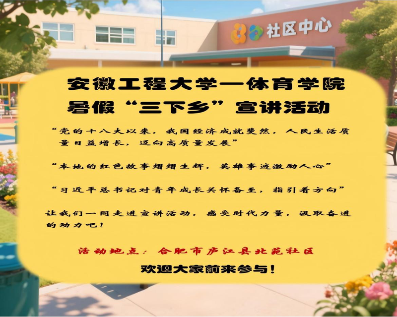 7月3日,体育学院暑期“三下乡”社会实践团队赴安徽省合肥市庐江县北苑社区,开展“传承红色基因,赋能乡村振兴”主题红色宣讲活动。青年学子与基层群众共同学习习近平总书记关于青年成长的重要论述,践行“请党放心,强国有我”的誓言。
