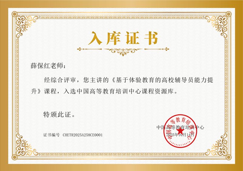 近日,我校薛保红体验教学团队报送的《基于体验教育的高校辅导员能力提升》专题课程经过多轮严格筛选,成功入选中国高等教育培训中心授课阵容,面向全国高校辅导员开展线上教学。这是我校教师首次获此资格,标志着学校在体验教育领域的深耕成果获得全国高等教育领域的认可。