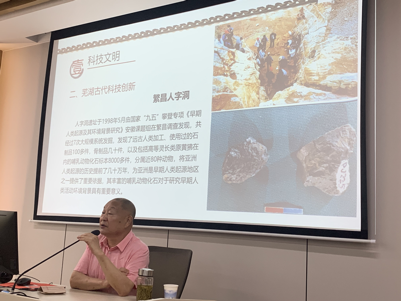 王东认为,芜湖优秀传统文化可以从科技文明、工商业文明、市民社会文明等多方面体现,他聚焦芜湖古代的科技文明,从考古、水利、冶炼、农业、浆染、中医等几个方面入手,分析了古代芜湖在多个领域创造出的辉煌成就。比如繁昌的人字洞,是欧亚古人类活动最早的遗址之一;芜湖先民开凿出了世界上较早的人工运河胥河,利用青弋江、水阳江等水系建成“中江”,使芜湖通江达海,交通便捷;北宋时期又建成伟大的水利工程万春圩,形成人水相依、人水相怡、繁荣富庶的景象,为芜湖成为“四大米市”之首奠定了基础;芜湖在冶炼行业更为突出,从“干将莫邪铸剑的传说”到全国重点文物“大工山古铜冶”,到“铁到芜湖自成钢”,再到“芜湖铁画”的诞生,无不表明芜湖是较早进入铁器时代的地区之一,一直走在科技创新的前列。他更勉励同学们在先辈的基础上,发愤图强,练好本领,服务家乡、建设家乡,用英语向世界讲好“芜湖故事”。