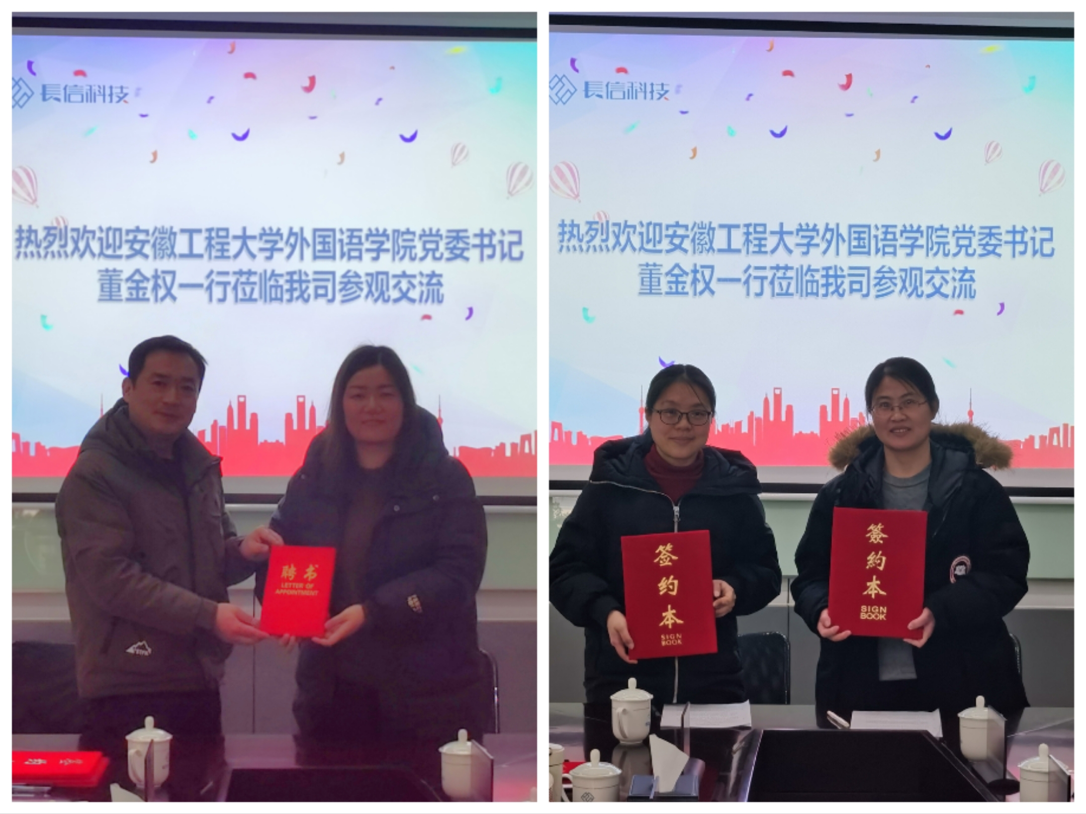 以党建共建推动合作共赢。在长信科技股份有限公司,黄红和鲁静分别从企业发展历程、人才需求情况等方面做了详细介绍。董金权代表学院党委对公司的接待表示感谢,介绍了学院的党建工作、学科和专业设置等情况。李校林对学院毕业生就业情况做了分析和说明。李新国就学院打造“企业课堂”引入企业资源提升人才培养质量情况做了介绍。双方围绕“党建促发展”开展深入交流,在党建引领发展、赋能人才培养等方面达成合作共识。现场,李校林与中共芜湖长信科技股份有限公司委员会组织委员徐娇签署党建共建合作协议。董金权向鲁静颁发“企业课堂”导师聘书。