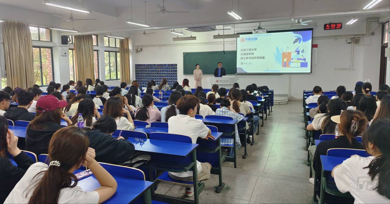 3月20日下午在6教111教室,外国语学院成功组织了主题为“多元化升学”的学业规划宣讲。本次活动邀请到了学院副院长李新国以及安徽省金宁外事服务有限公司的易荣老师,24级全体同学和带班辅导员参与讲座。