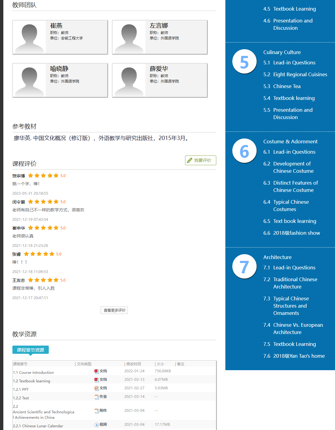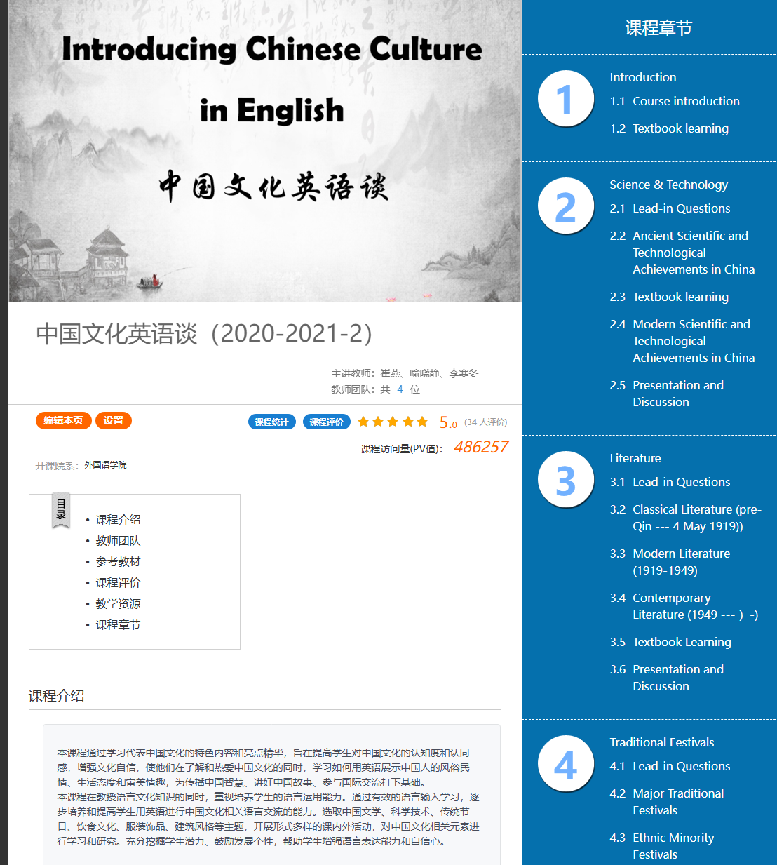 《中国文化英语谈》授课对象为我校非艺术类、非英语专业,且全国大学生英语四级考试成绩达425分及以上的本科低年级学生,是《大学英语》的后续拓展课程。团队教师:崔燕、左言娜、喻晓静、薛爱华。本课程对标《高等学校课程思政建设指导纲要》和国家一流课程建设标准,将课程思政贯穿整个教学体系,通过学习代表中国文化的特色内容,帮助学生增强对中国文化的深刻认识,学习如何用英语展示中国的风俗民情、生活态度、审美情趣及社会发展变化,提升文化自信,培养家国情怀,为传播中国智慧、讲好中国故事、参与国际交流打下基础。