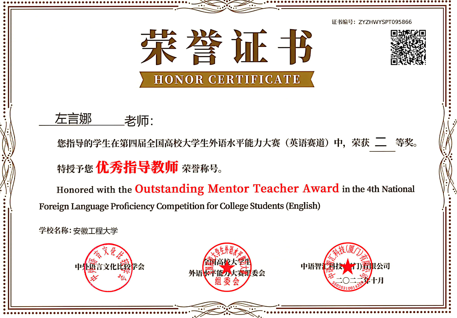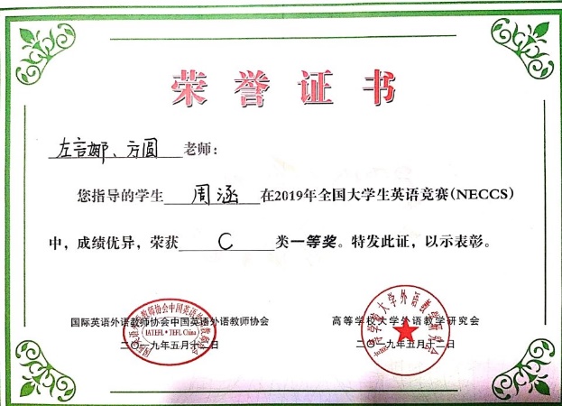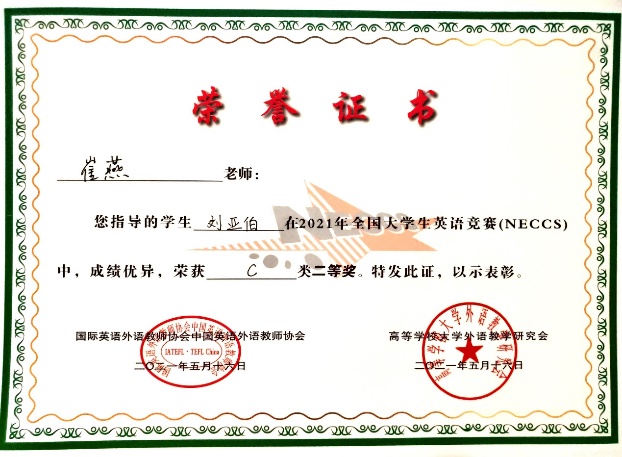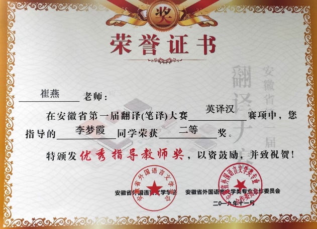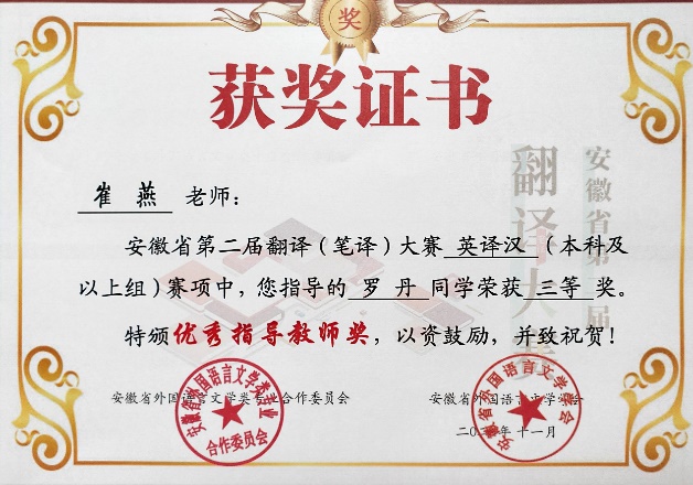 课程积极发挥第二课堂育人功能,课堂内外教书育人成效显著。在各类英语竞赛中,教师倾心指导学生,取得了良好成绩。在大学生英语竞赛、翻译比赛、演讲比赛、词汇大赛等方面成绩丰硕,其中指导学生参加2021年“庆祝中国共产党建党100周年”外研社杯“红星照耀中国”英语演讲比赛,进入校级决赛5人次,1人代表我校非英语专业学生与省内高校研究生、英语专业高年级学生同台竞技,获得省赛三等奖;参加徽文化英汉翻译比赛多人,并获奖多项。
