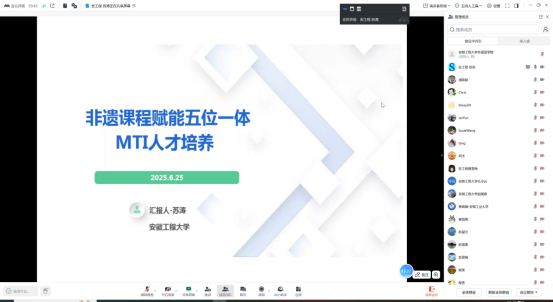 随后,苏涛带来“非遗课程赋能五位一体MTI人才培养”主题分享。他以《铁画艺术翻译》非遗特色课程为例,从课程创设背景、实施过程、建设成果及教学反思四个维度,系统讲述了该课程从无到有、发展为校企共建特色课程的历程。课程建设期间,学院成立铁画艺术翻译与国际传播研究中心,联合芜湖市铁画协会、博物馆打造科教融创实践基地,构建起产学研教创五位一体的MTI人才培养模式。在教学反思环节,苏涛针对AI时代人才培养提出思考,强调硕士生导师应明晰培养目标,引导学生合理运用AI技术,全方位提升社会适应能力。唐雪梅对苏涛在特色课程建设中付出的努力表示充分认可。