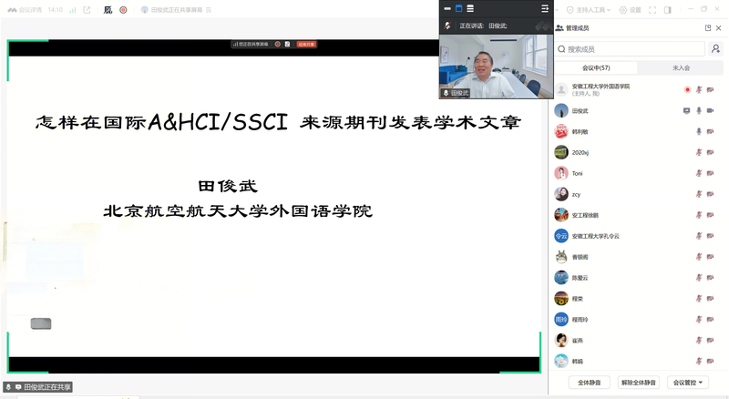 9月12日晚,应我校科技处、研究生部和外国语学院的邀请,北京航空航天大学博士生导师田俊武教授指导我校外国语学院教师高水平论文撰写与期刊发表并开展学术交流活动,作了题为“怎样在国际SSCI/A&HCI来源期刊发表论文”的学术报告。学院全体教师和研究生参加了报告会,报告会由学院副院长韩利敏主持。