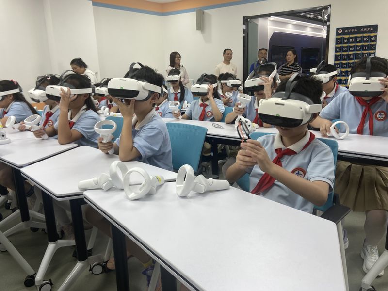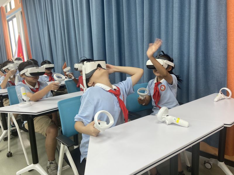 在老师的带领下,学生们满怀好奇地走进实验室,戴上先进的VR头盔,沉浸式体验《道德经》故事的深刻寓意。他们化身为虚拟角色跨越国界,感受异域文化,与虚拟场景中的各国人物展开对话。尽管英语发音还比较青涩,但每一个单词都蕴含着他们对未知世界的探索热忱。系统自动记录下他们的声音,并立即进行精准的语音、语调与语义评判。这些数据被实时转化为可视化的学习报告,如同游戏通关记录般直观地呈现在屏幕上,让孩子们清楚地看到自己的进步与不足。
