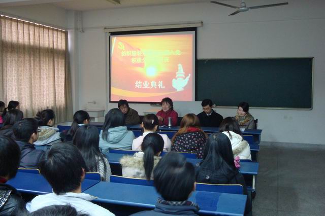 典礼开始,全体起立,奏国歌。余新霞书记作了重要讲话。她对本次培训班学员们认真遵守党校培训纪律、努力学习党的理论知识、提升思想政治素养、积极参加党校安排的各项实践活动给予充分的肯定,并用胡锦涛同志在《在同中国农业大学师生代表座谈的讲话》中提出的四点希望来勉励青年学子要爱党爱国,勤奋学习、积极进取、报效祖国。刘金斌副书记宣读了本期培训班15位优秀学员名单,出席典礼的各位领导为优秀学员颁发了证书。服工082班王肖莉同学作为学员代表发言。最后全体学员