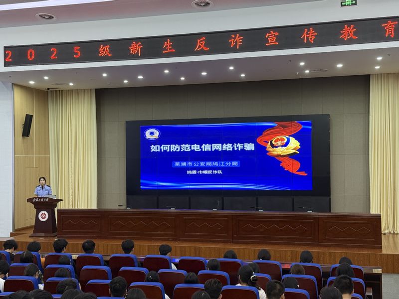 本网讯 为切实增强2025级学生防范电信网络诈骗的意识,提升校园安全水平,9月16日,人工智能学院联合校安全管理处在图书馆5楼报告厅举办“智院防诈 安全领航”防诈骗安全教育专题讲座。本次讲座特邀芜湖市公安局鸠江分局鸠盾·巾帼反诈队郭静微警官主讲,校安全管理处相关人员、新生辅导员以及全体新生参加活动。