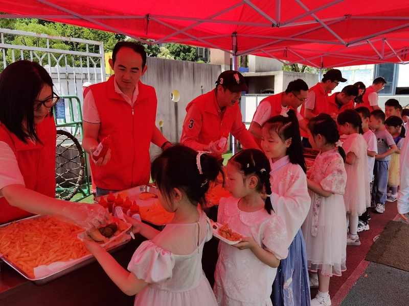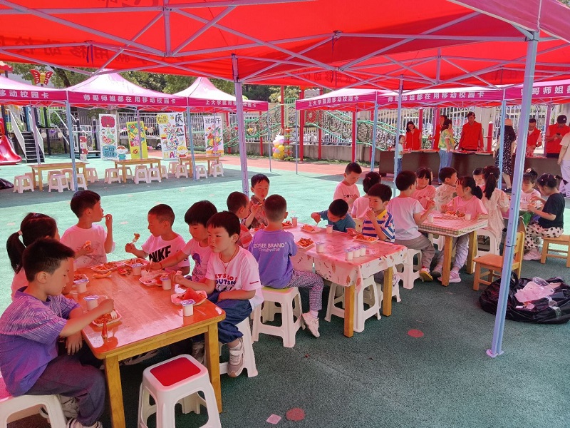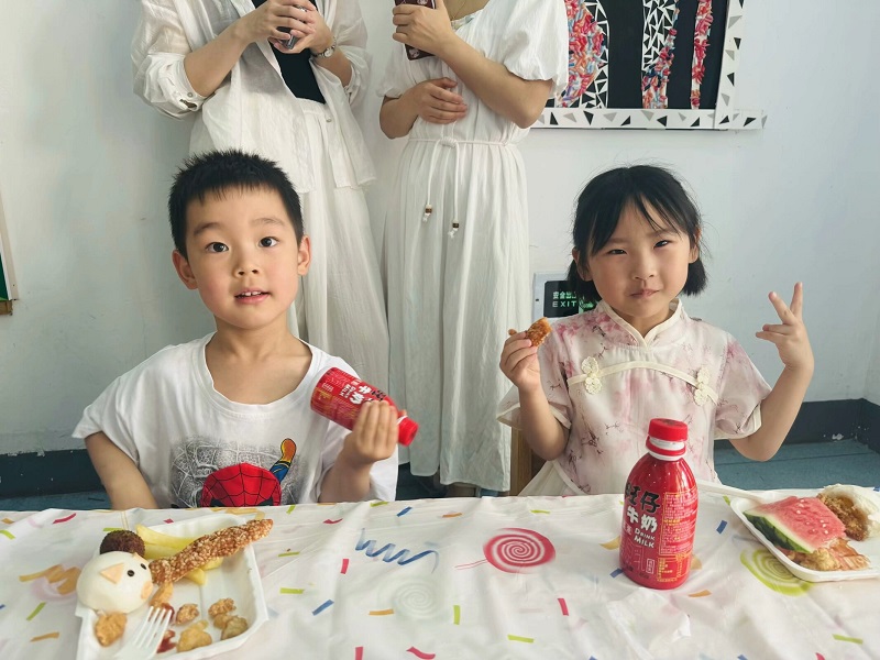 节日的快乐还在继续——美食自助环节让孩子们欣喜不已。金黄酥脆的鸡米花、香甜爽口的瓜果和清凉解渴的酸奶……让小朋友们目不暇接。孩子们端着餐盘穿梭在自助摊位间,开心地挑选着自己喜爱的美食,尽情享受节日的快乐。
