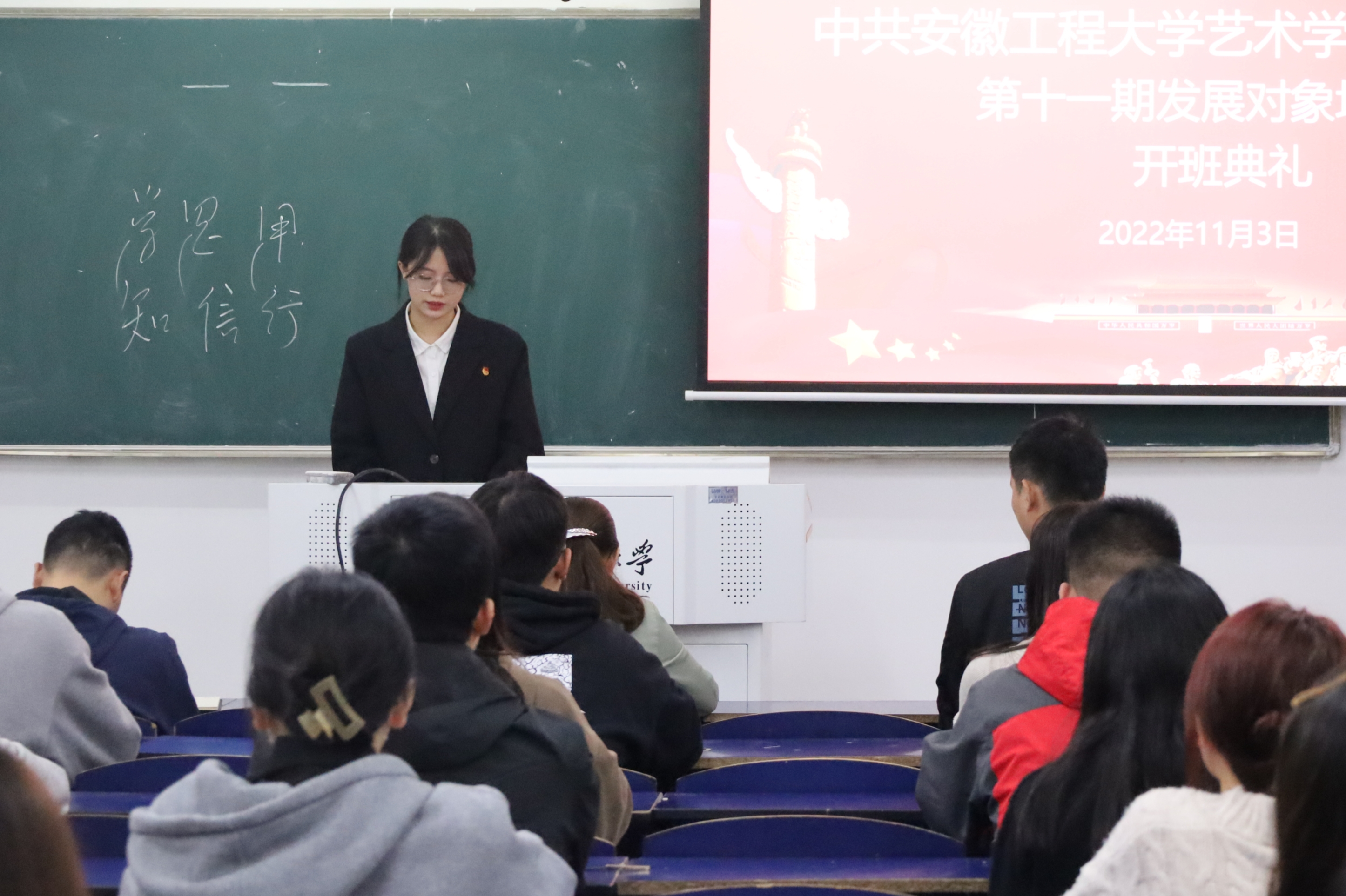 为深入学习宣传贯彻党的二十大精神,按照学校“三抓”和“三全六专”工作要求,切实提升党员发展质量,激励广大党员发展对象以昂扬姿态奋进新征程,113日下午,艺术学院分党校在6108举行第十一期发展对象培训班开班仪式。学院党委副书记彭海燕、团委负责人袁自坤及各学生党支部书记出席。培训班班主任姚丽主持。